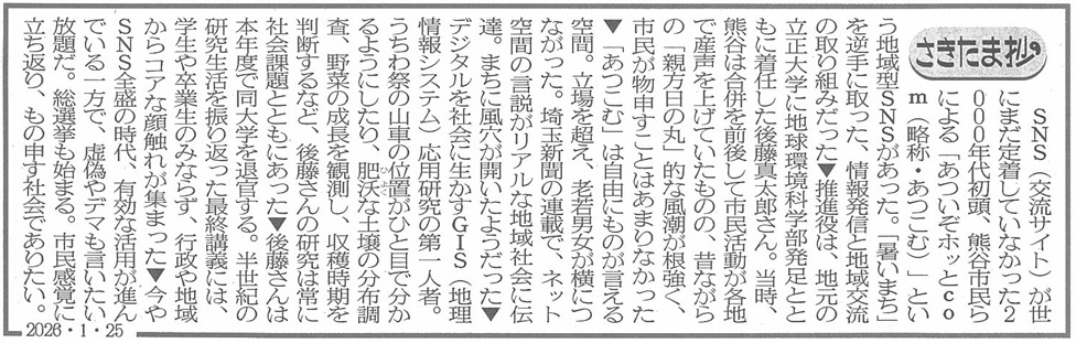 1/25の埼玉新聞1面の社説コラム「さきたま抄」にて、地球環境科学部環境システム学科後藤教授の最終講義の様子、これまでの研究活動が紹介されました。