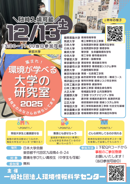 - 12/13 集まれ環境が学べる18大学の研究室にて研究内容の説明を行いました。